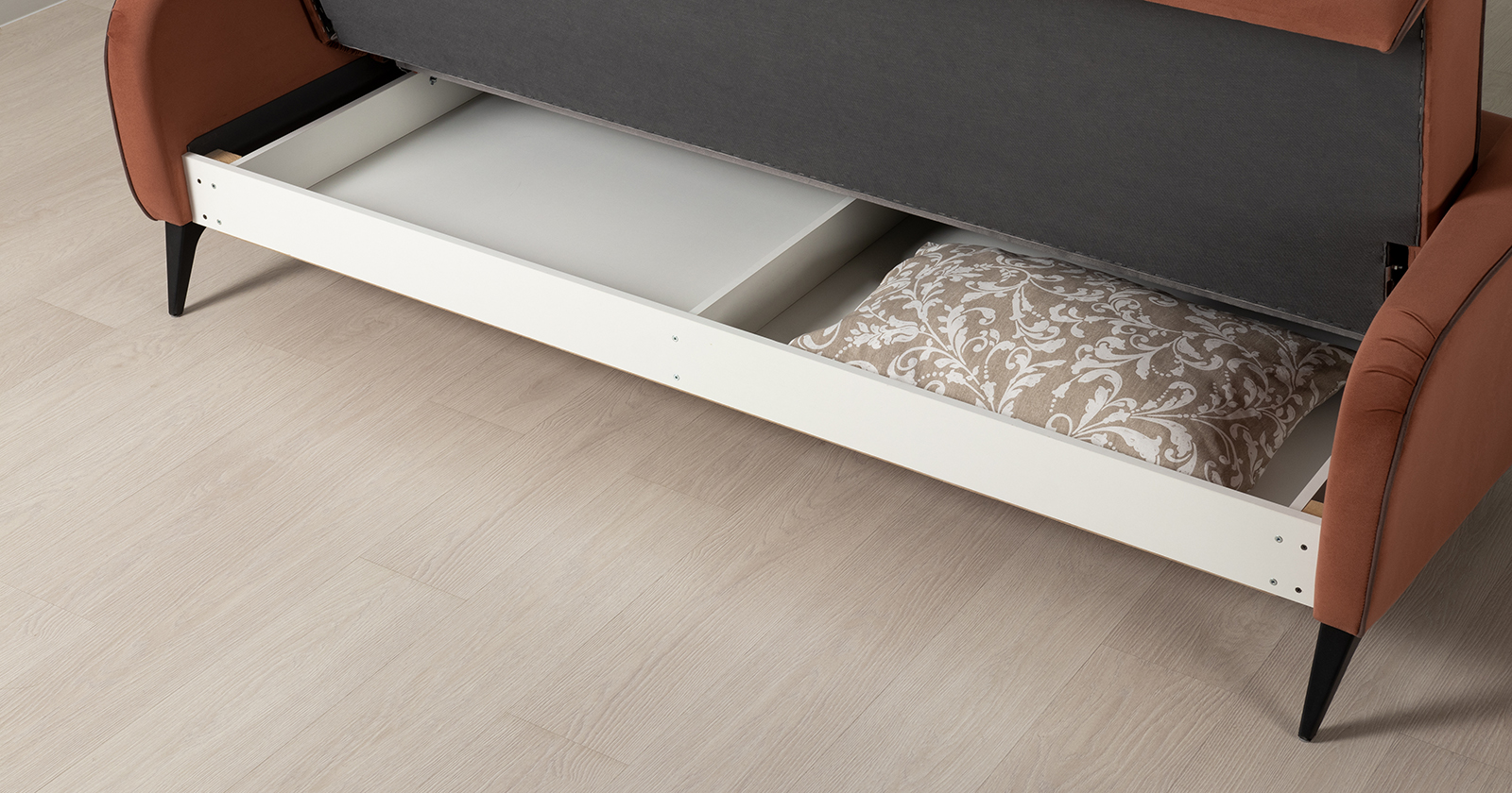 Спинка и сиденье разделяются пополам двойным кантом по центру и одинарным по краям сидения, для придания одной единой формы. Подлокотники с изгибом на лицевой стороне и мягкими закругленным углом со складками, с выраженным контрастным ровным кантом по внешнему контуру изделия и изогнутой линией канта.