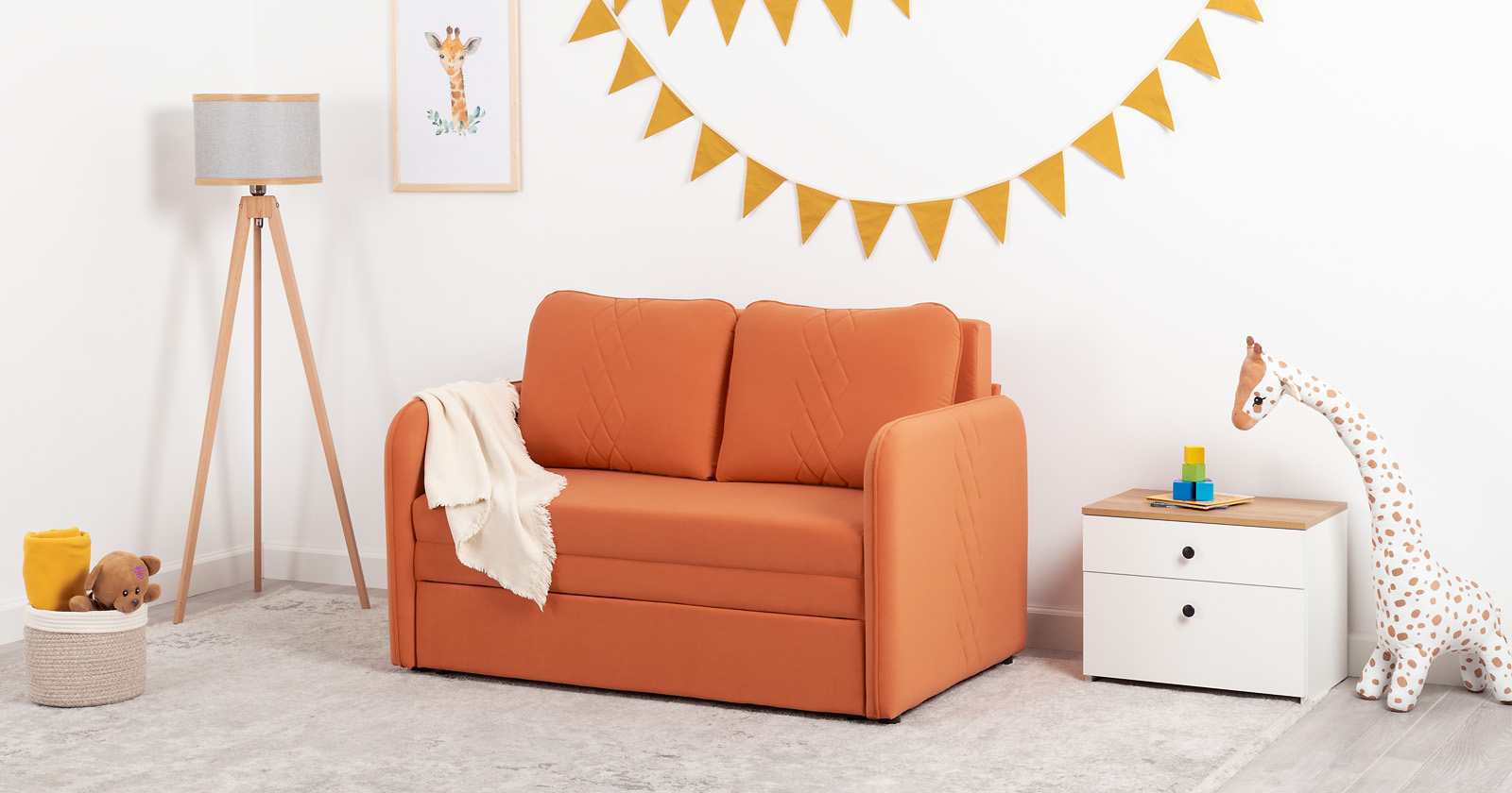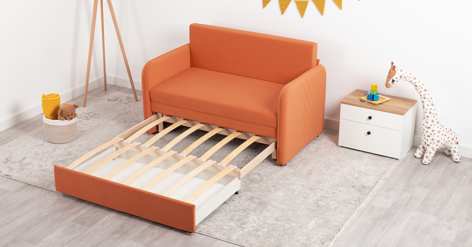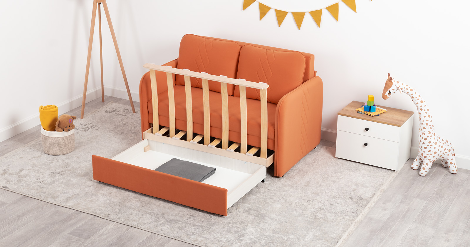 Стильный компактный диван для детской и гостиной. При своих скромных размерах он трансформируется в полноценное спальное место для детей и подростков. Лаконичный дизайн в виде декоративной стежки подчеркивает фактуру велюра, а небольшие размеры позволят разместить его в любом пространстве.