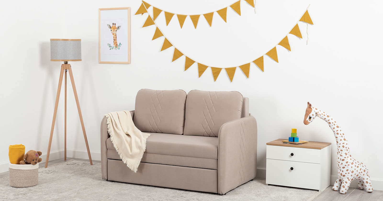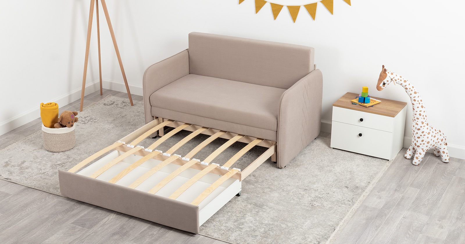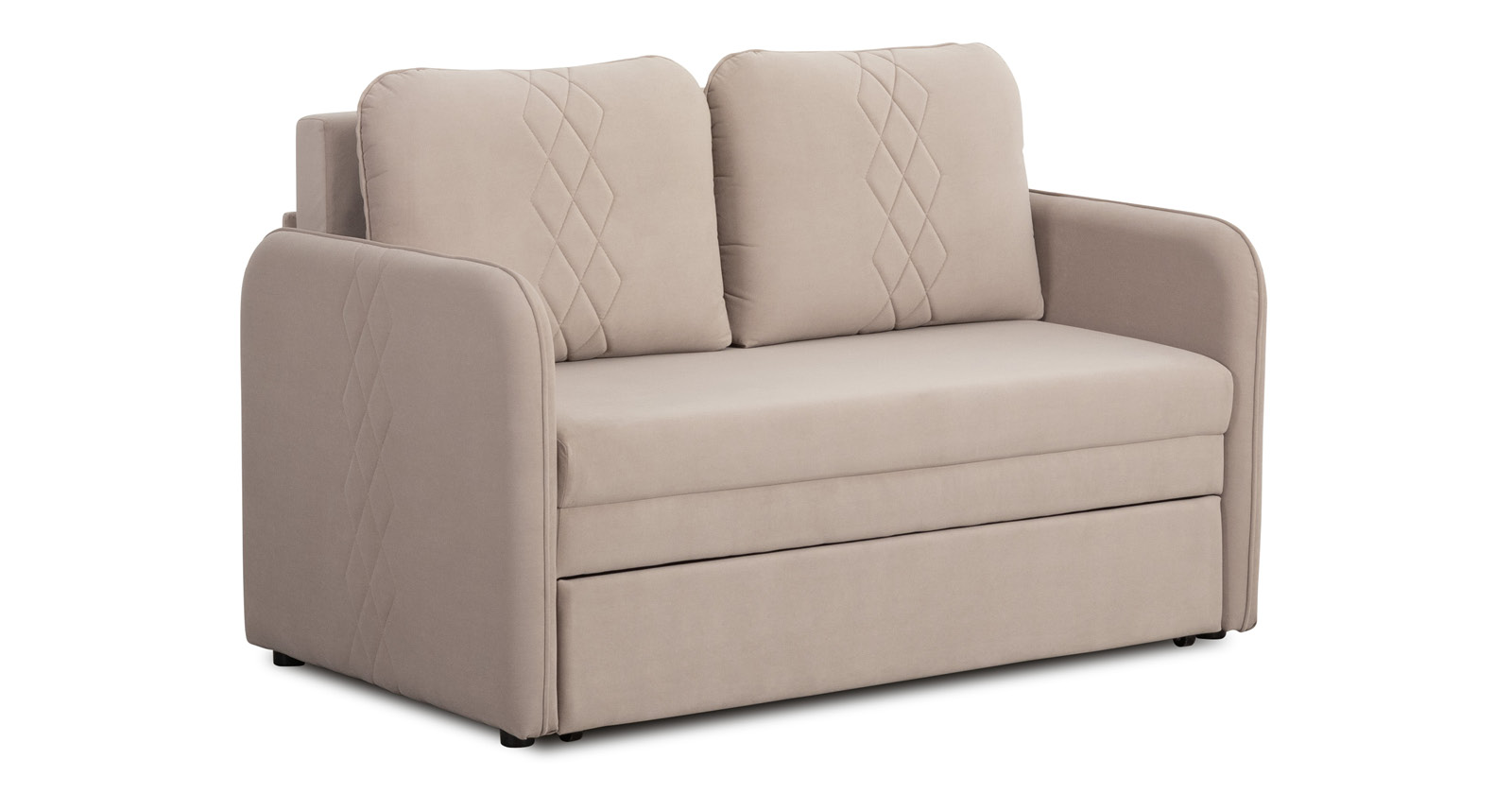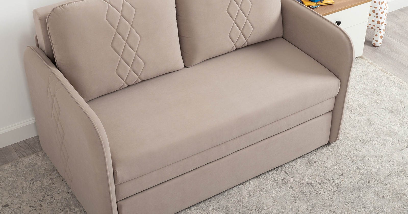 Стильный компактный диван для детской и гостиной. При своих скромных размерах он трансформируется в полноценное спальное место для детей и подростков. Лаконичный дизайн в виде декоративной стежки подчеркивает фактуру велюра, а небольшие размеры позволят разместить его в любом пространстве.