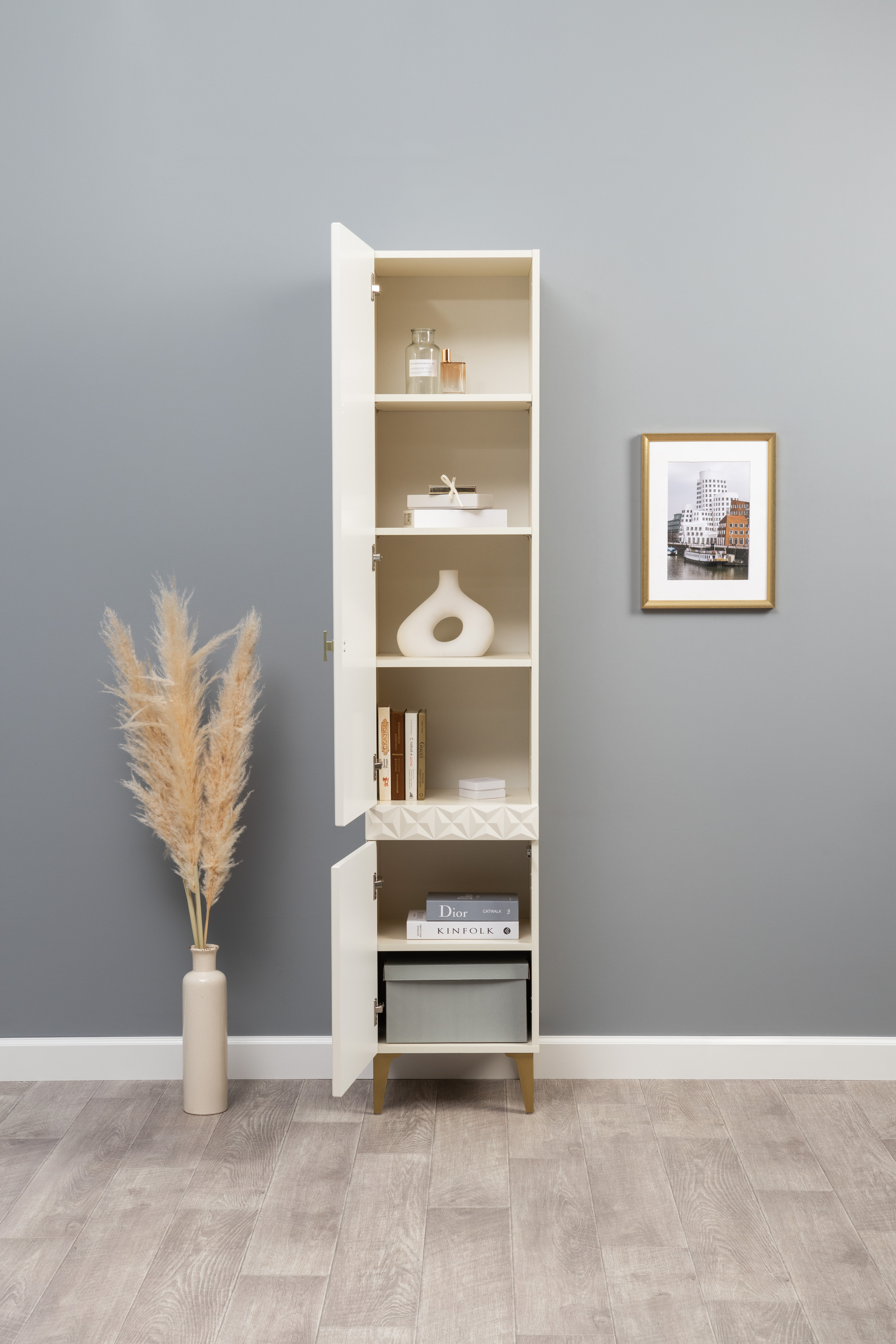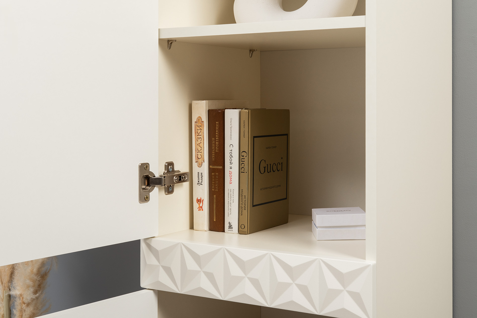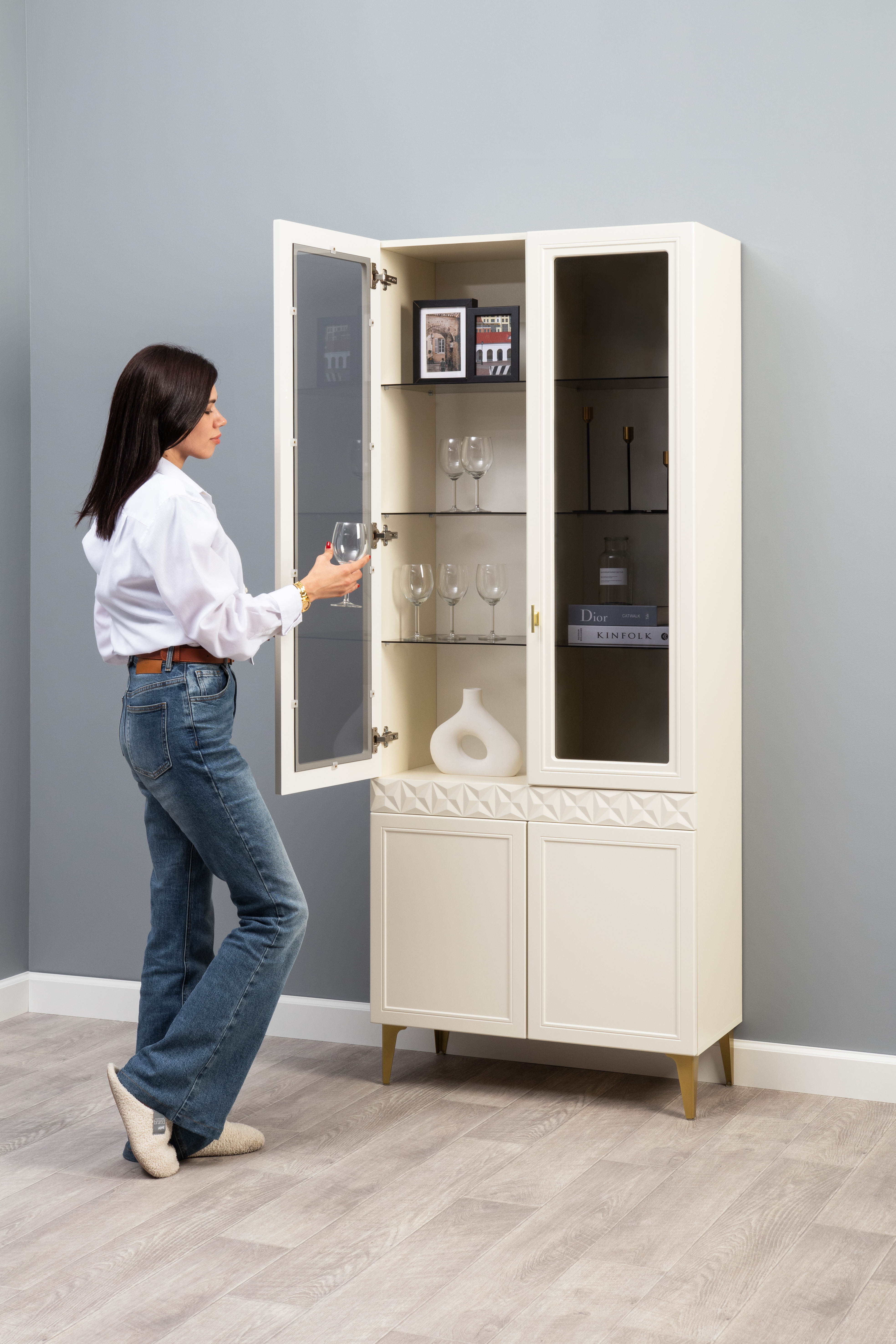Шкаф-витрина Марион 16.397.01 слоновая кость С341 PE, слоновая кость 6898 ПВХ (собирается на любую сторону)