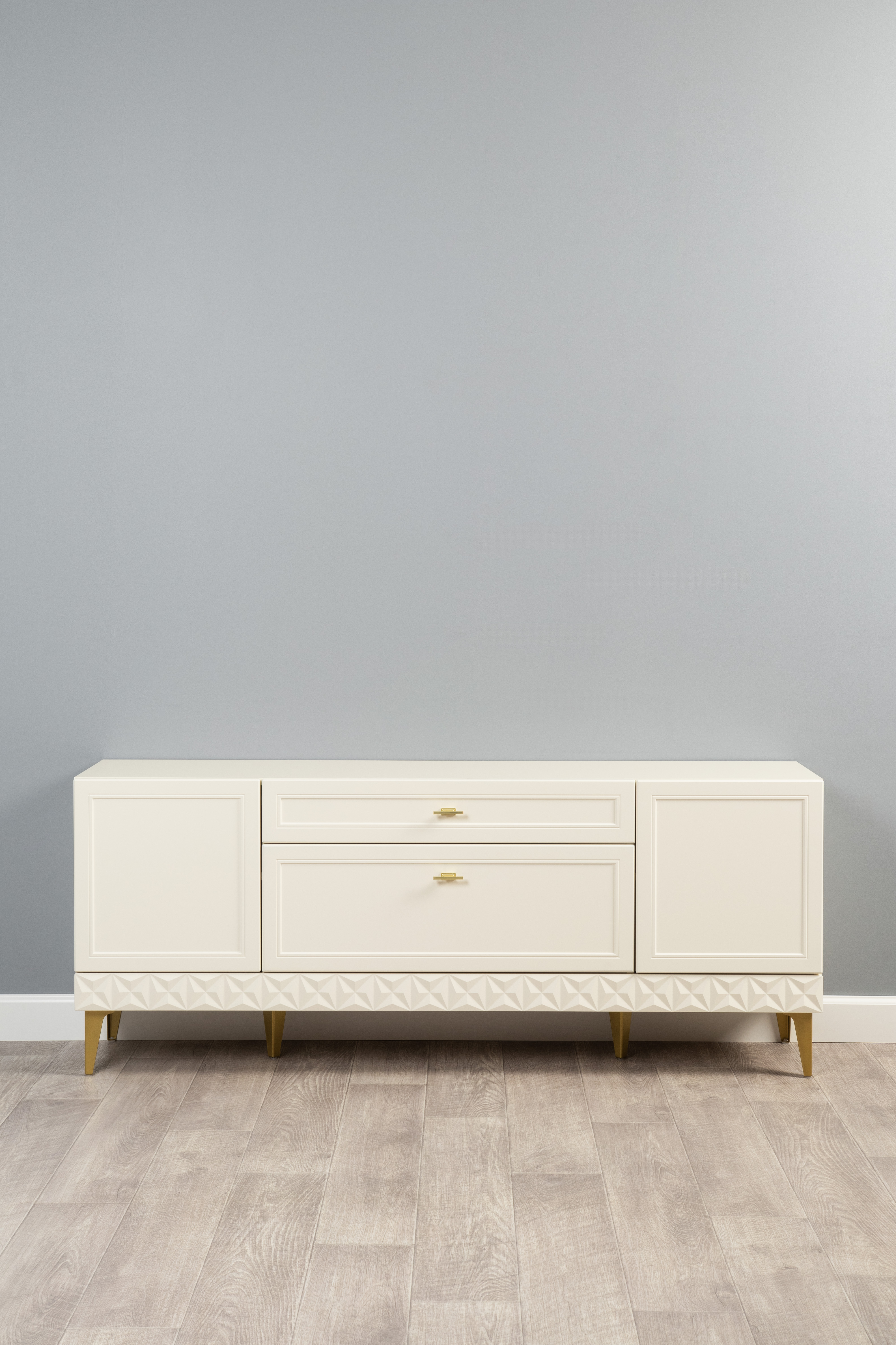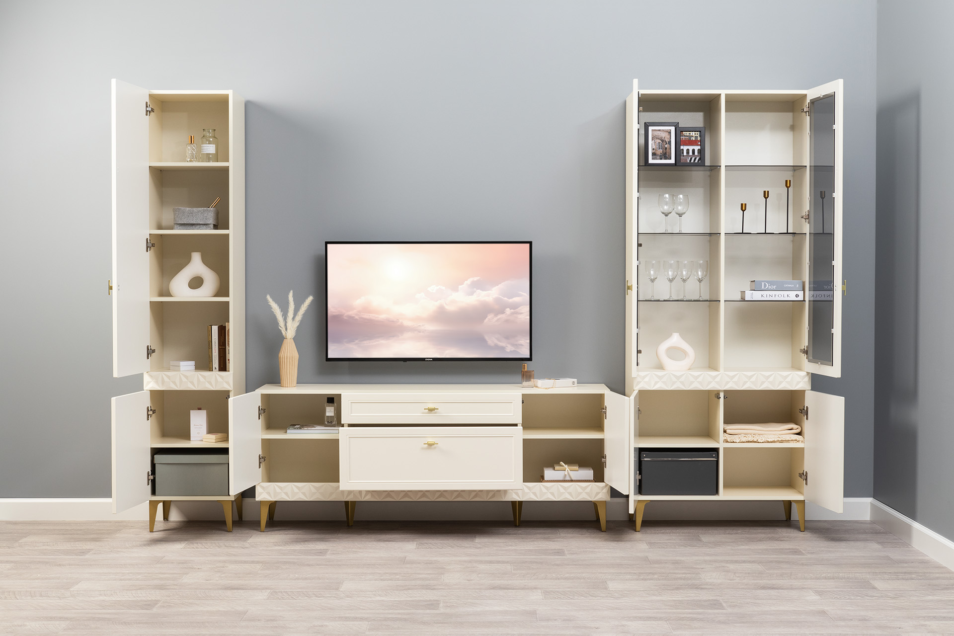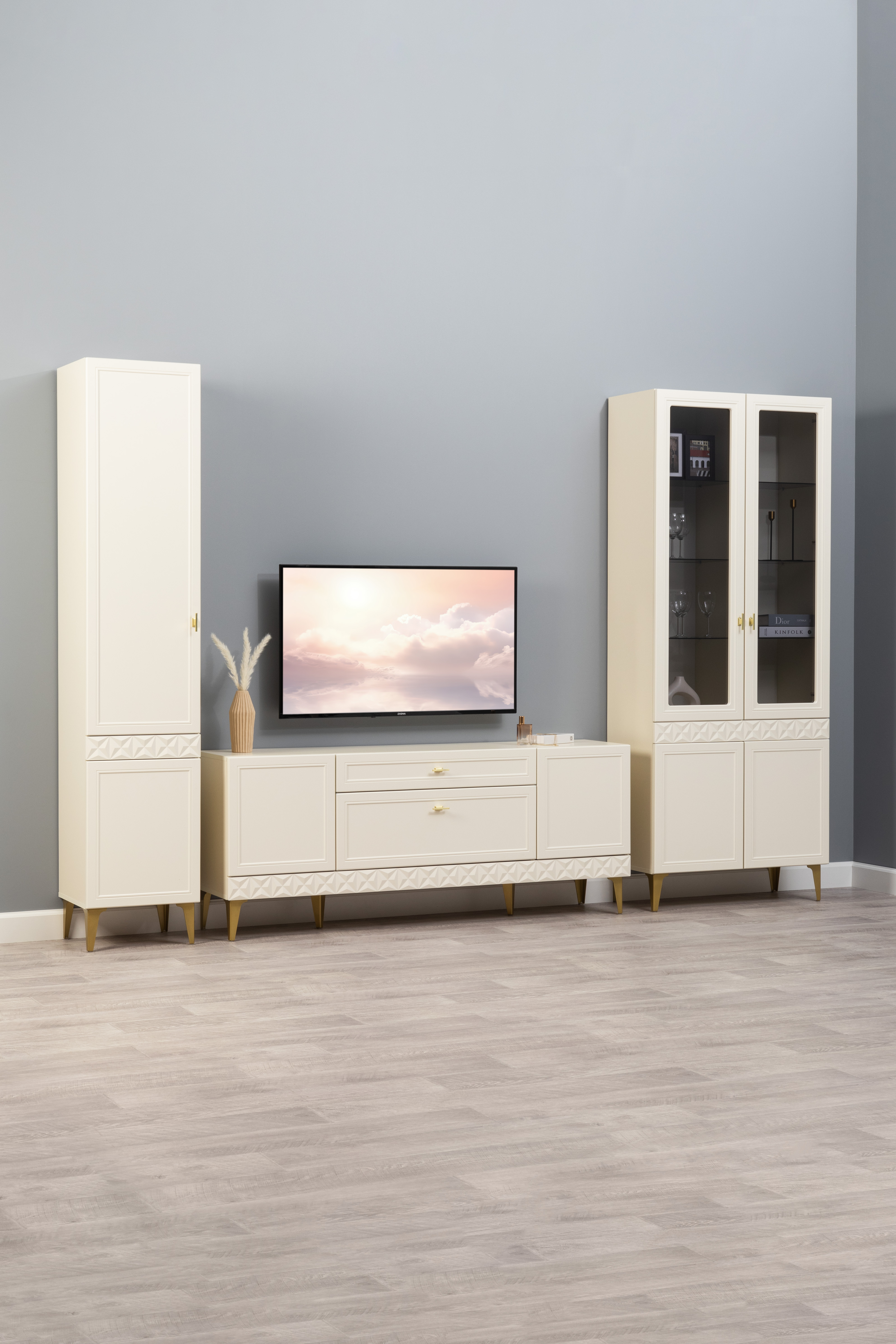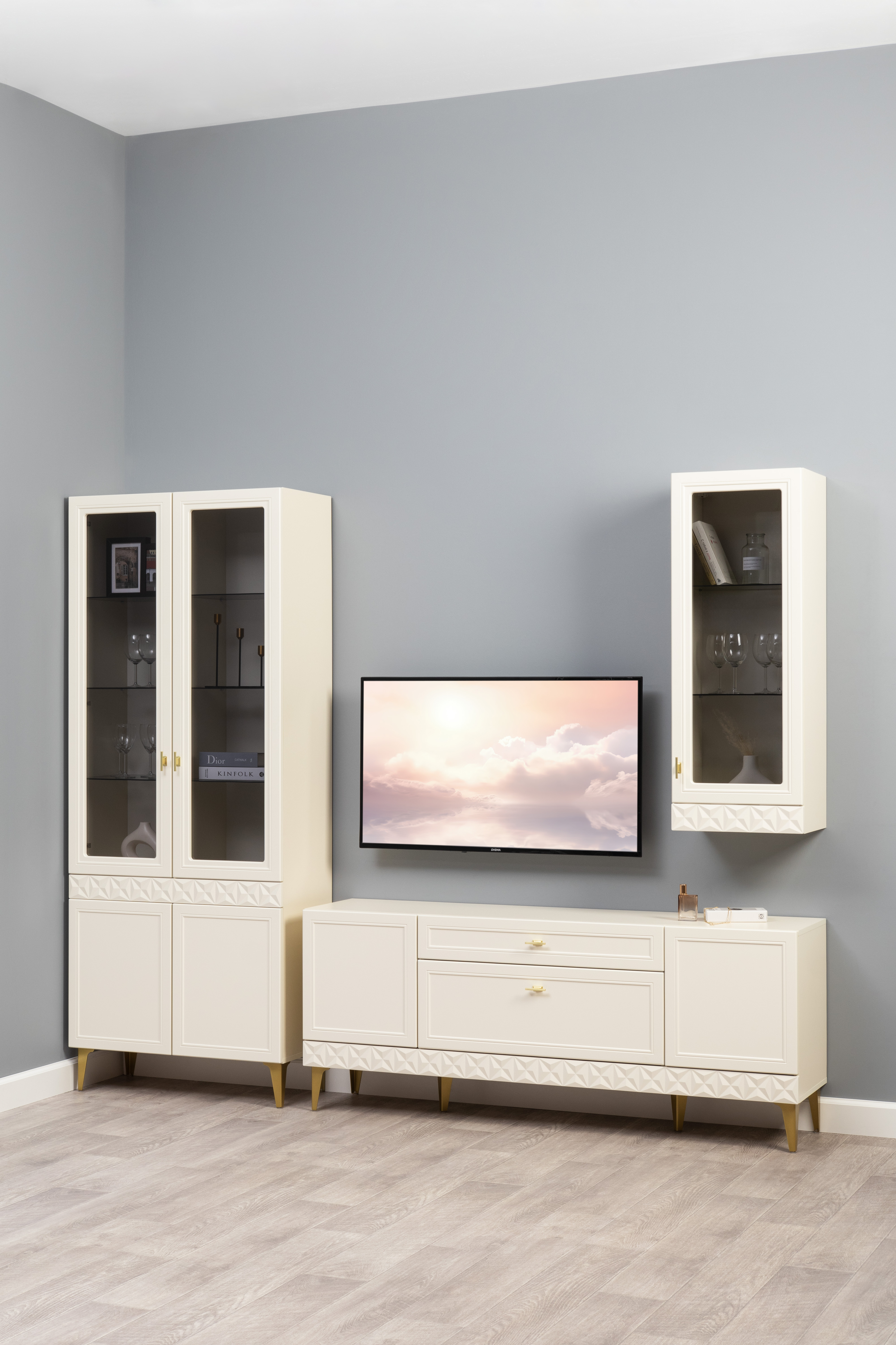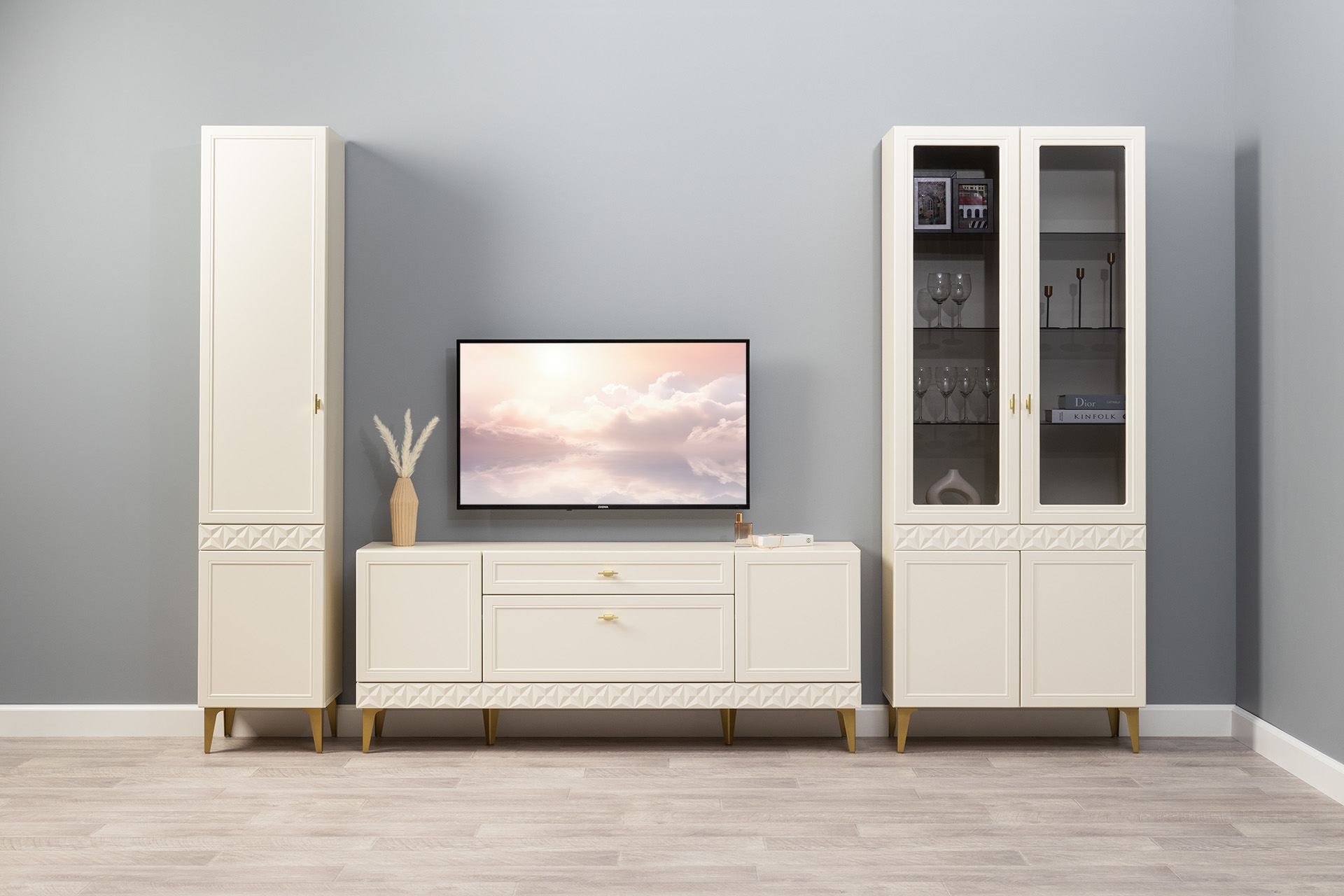 Гостиная Марион композиция 2 слоновая кость С341 PE, слоновая кость 6898 ПВХ, белый PE шагрень (собирается на любую сторону)