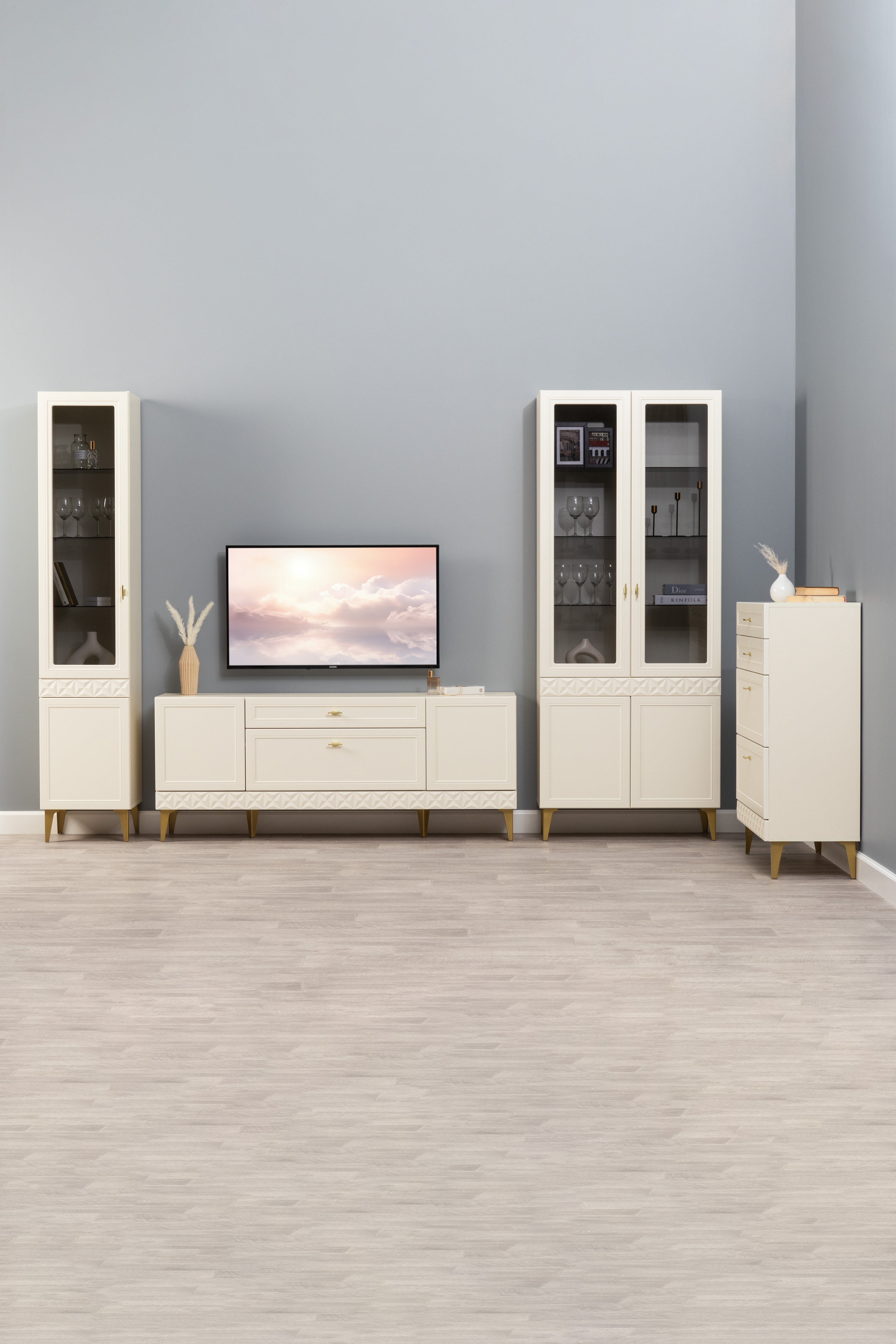 Гостиная Марион композиция 3 слоновая кость С341 PE, слоновая кость 6898 ПВХ, белый PE шагрень (собирается на любую сторону)