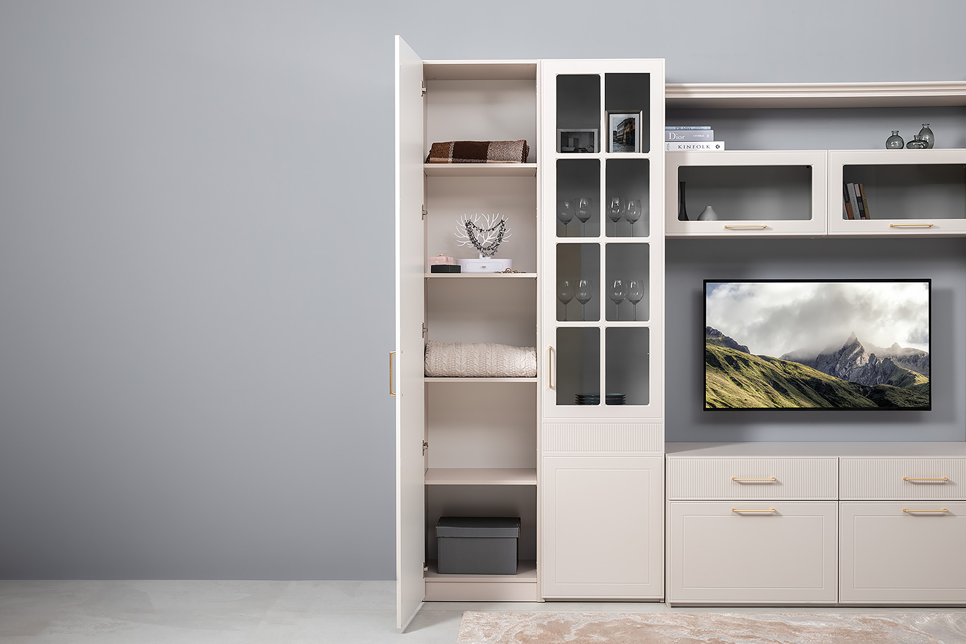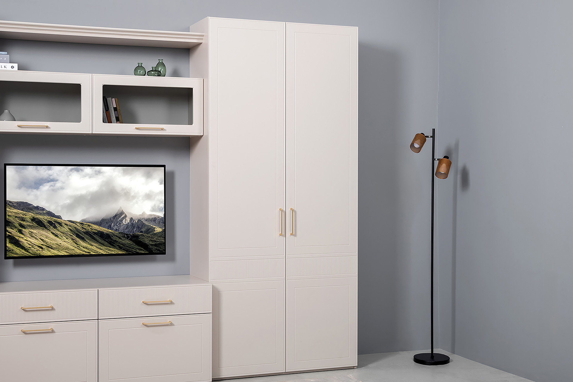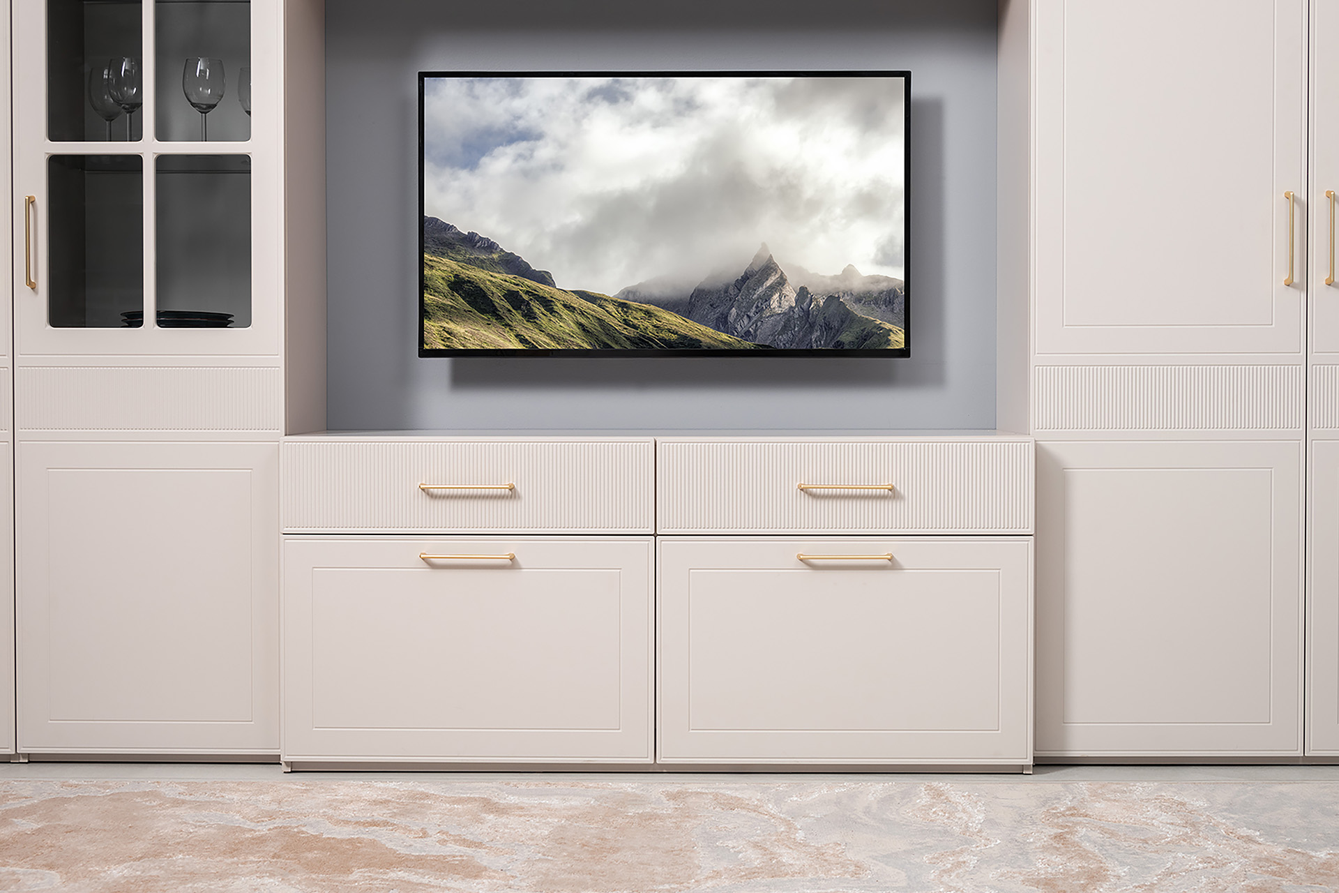 Гостиная Ричфорд композиция 1 без карнизов, кашемир 5981 BS, моно керамика D166-2 ПВХ, белый PE шагрень (собирается на любую сторону)