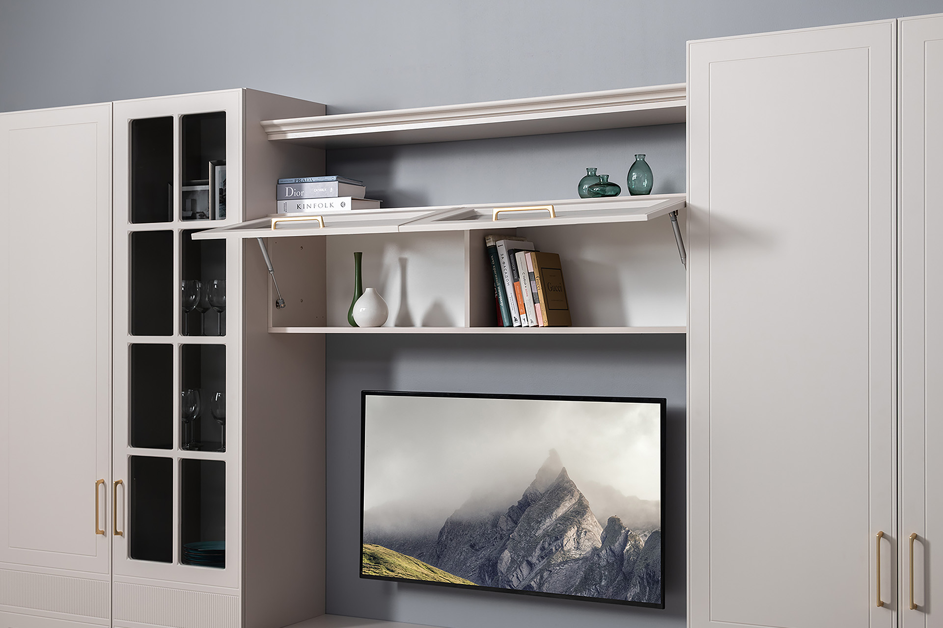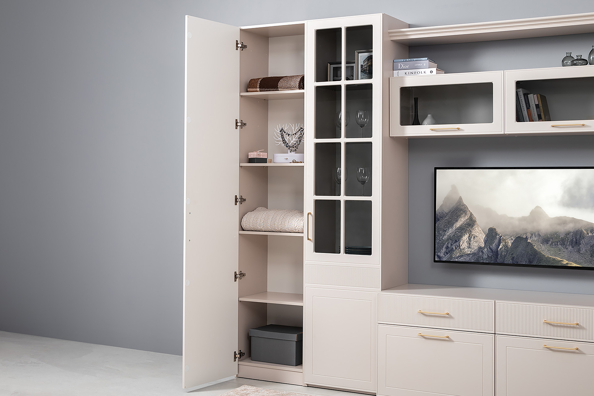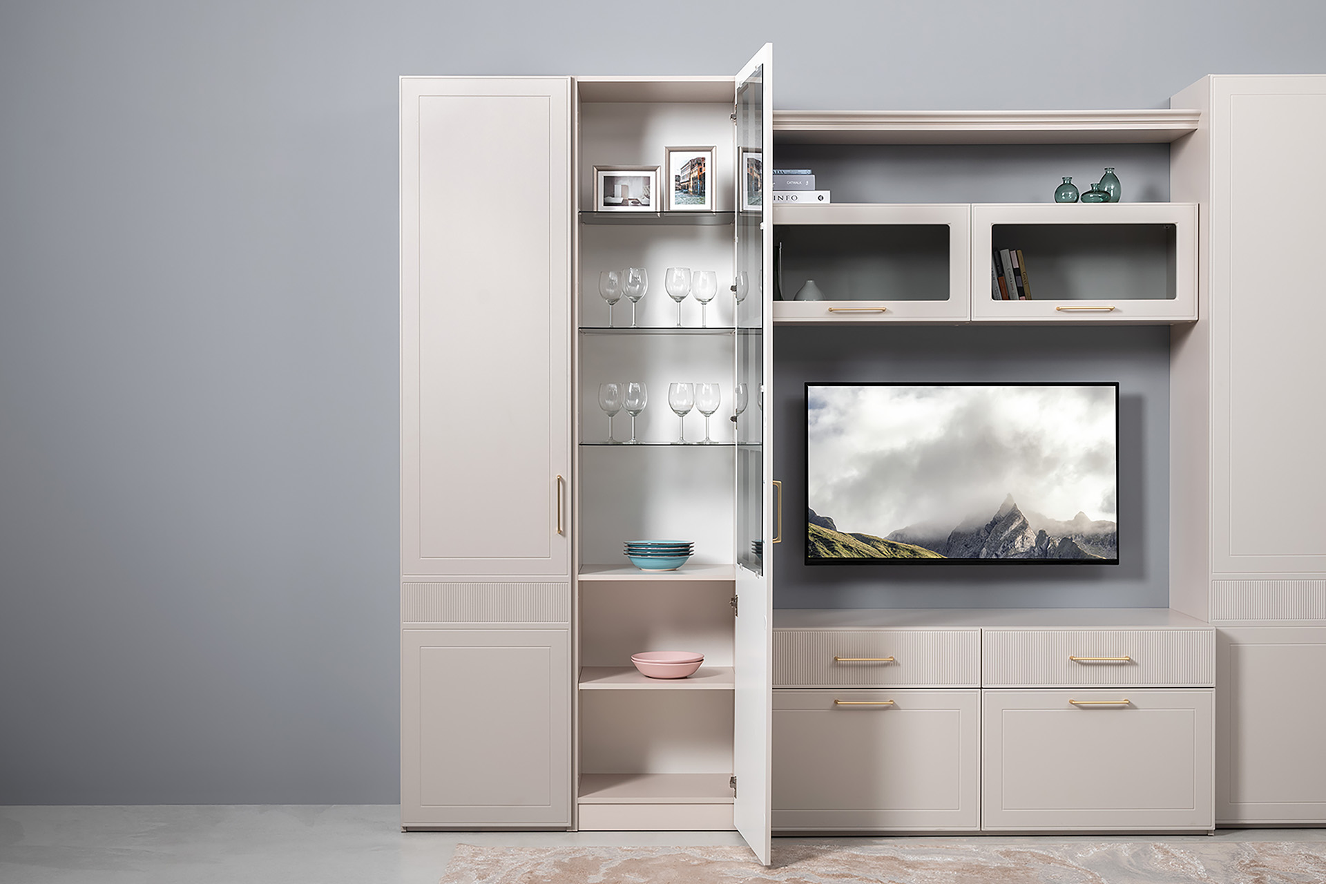 Гостиная Ричфорд композиция 1 без карнизов, кашемир 5981 BS, моно керамика D166-2 ПВХ, белый PE шагрень (собирается на любую сторону)