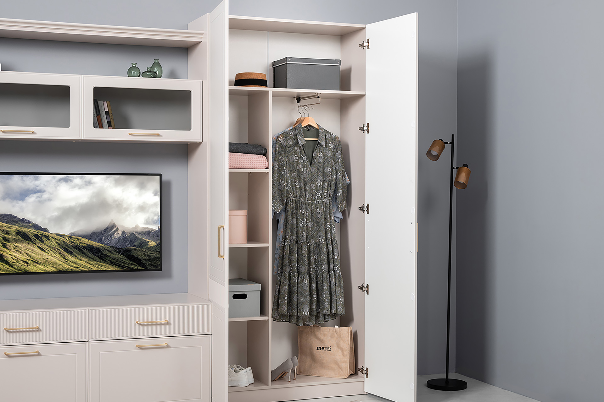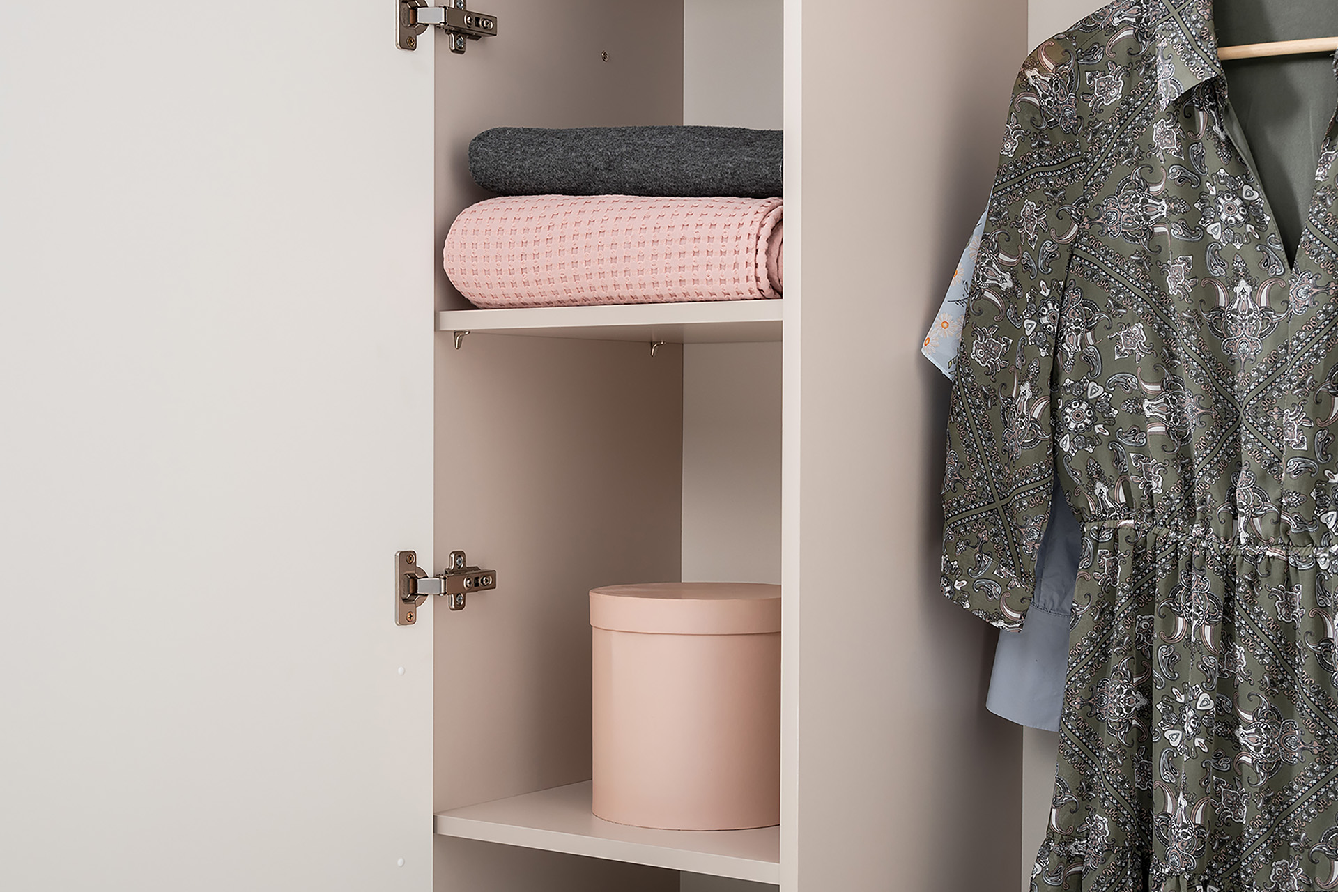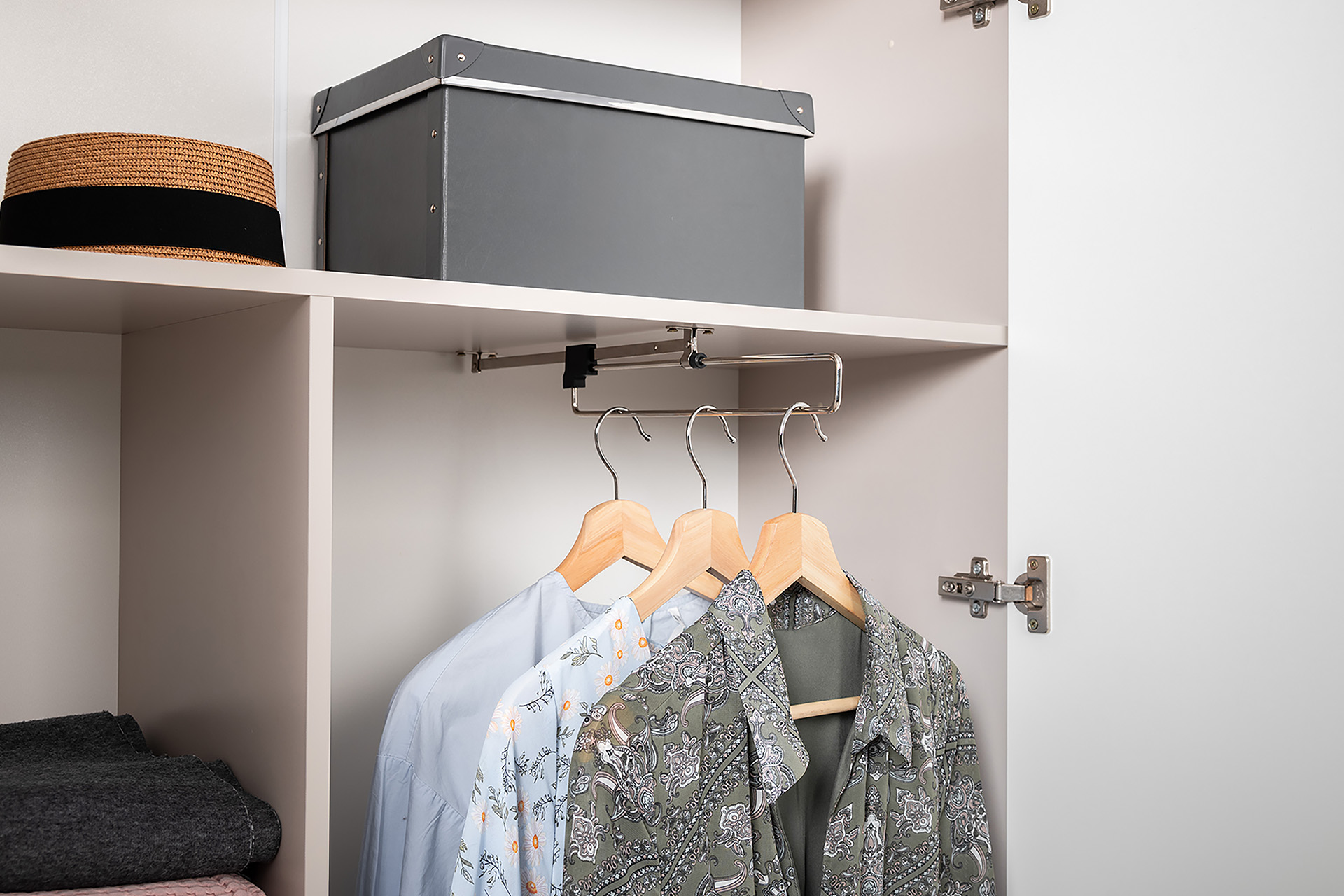 Петли с доводчиками, полное выдвижение ящиков, выдвижная штанга в шкафу для одежды и съемные полки делают использование максимально комфортным.