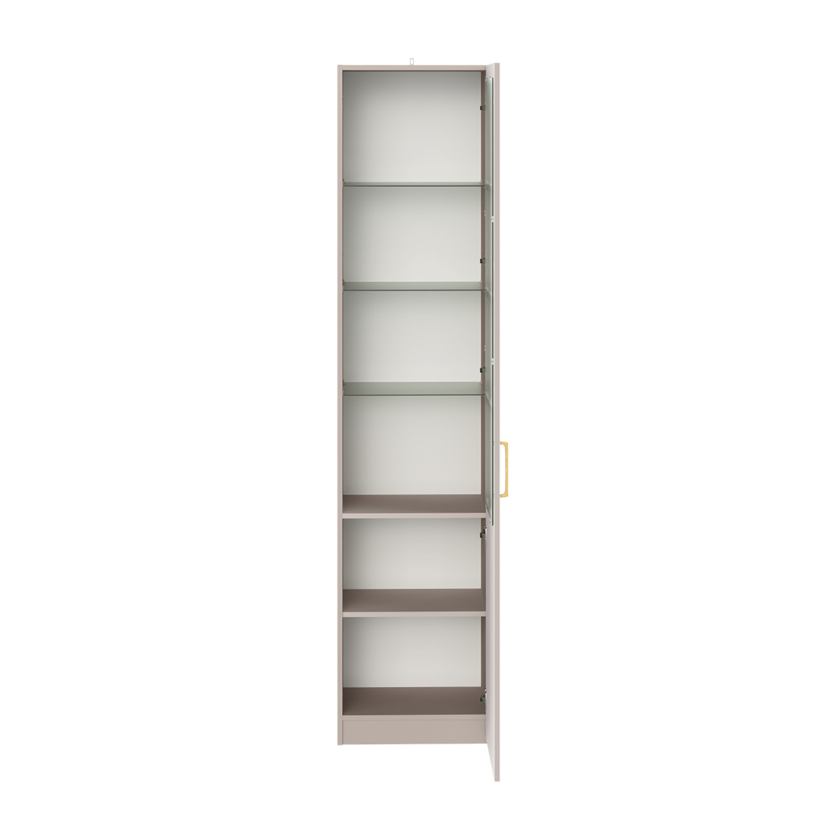 Фрезерованные фасады из МДФ, металлические ручки и витрины с тонированным стеклом создают изысканный образ.
