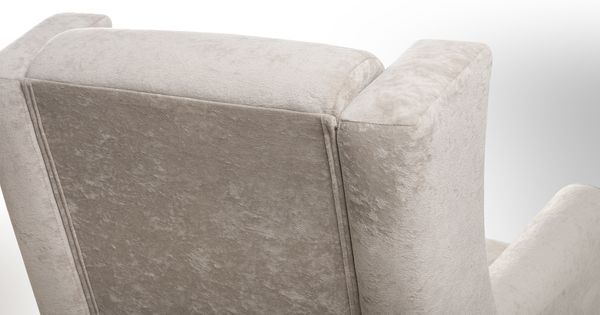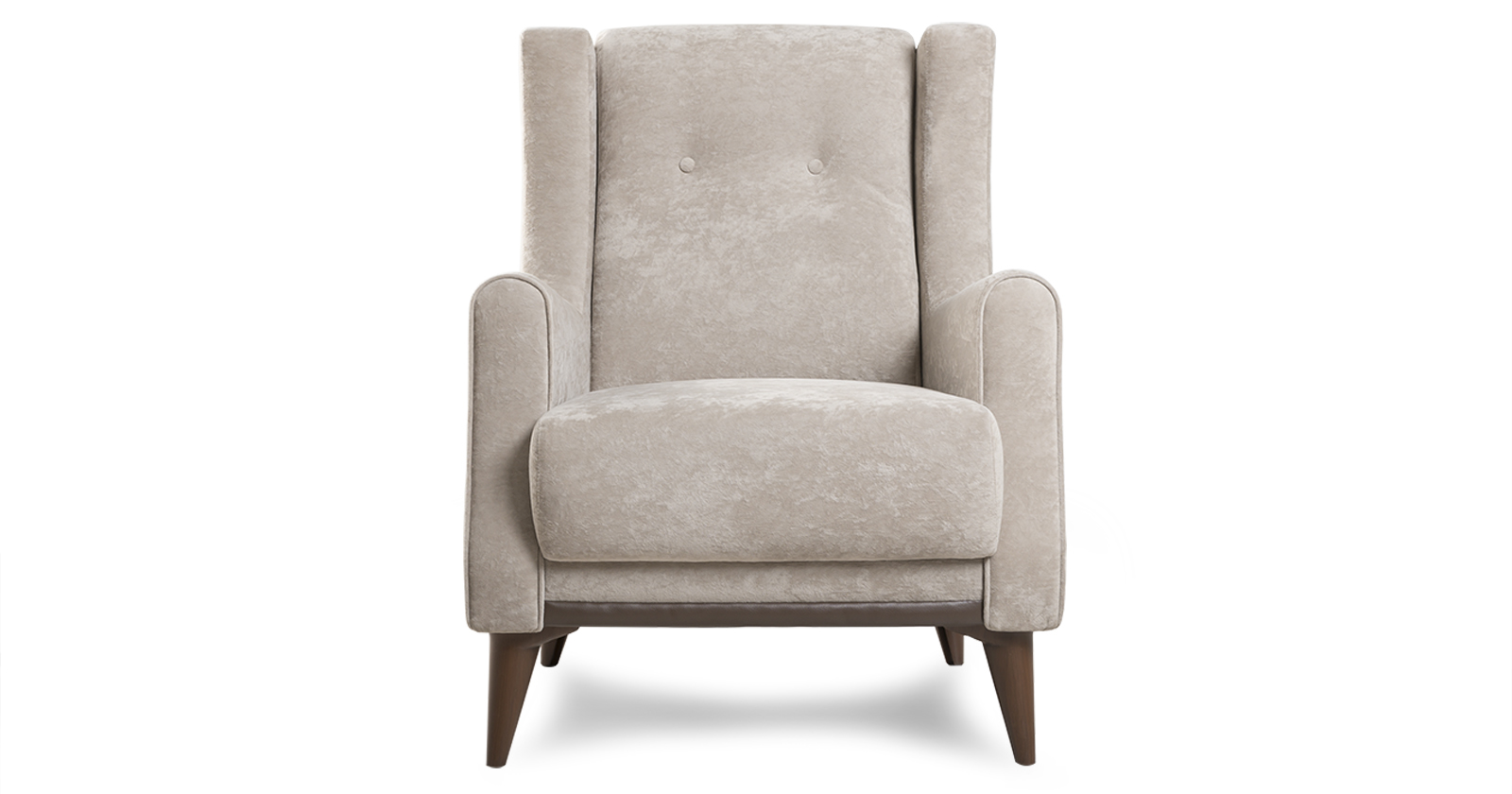 Декоративный кант из основной ткани по переднему торцу подлокотника; Утяжка спинки на 2 декоративные пуговицы из основного материала; Декоративный элемент царги из материала-компаньона.