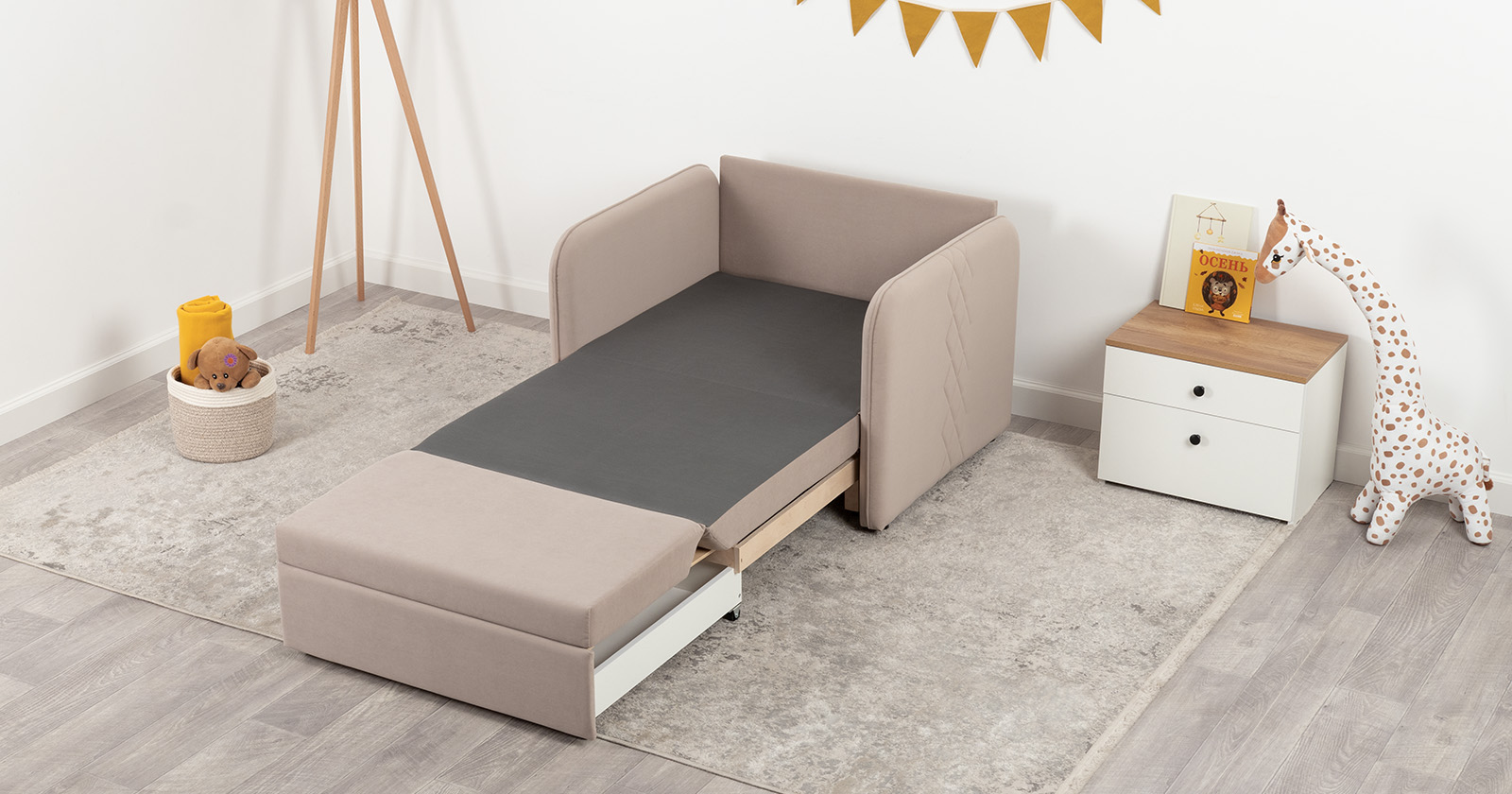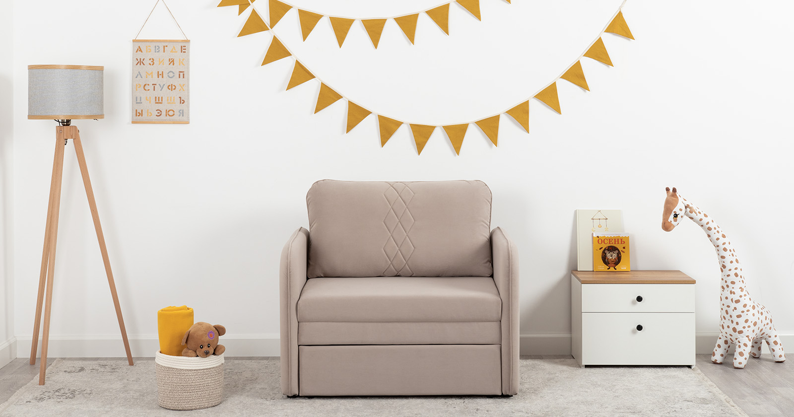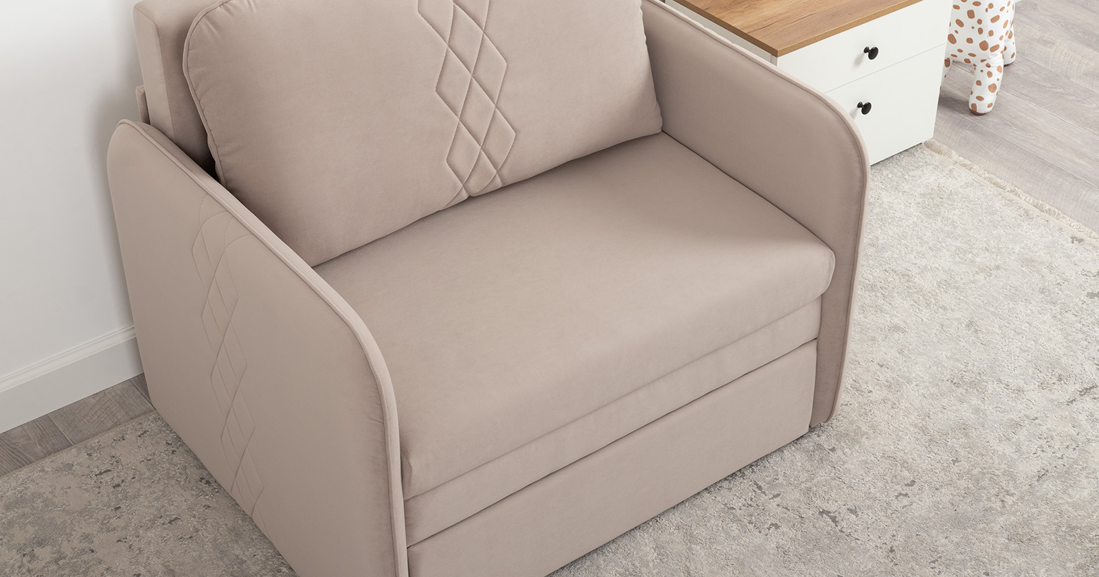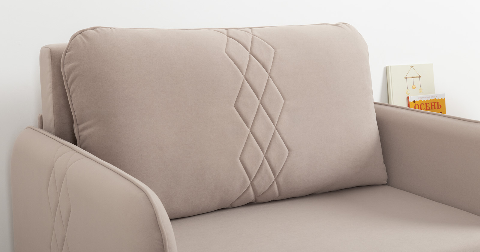 Стильный компактный диван для детской и гостиной. При своих скромных размерах он трансформируется в полноценное спальное место для детей и подростков. Лаконичный дизайн в виде декоративной стежки подчеркивает фактуру велюра, а небольшие размеры позволят разместить его в любом пространстве.