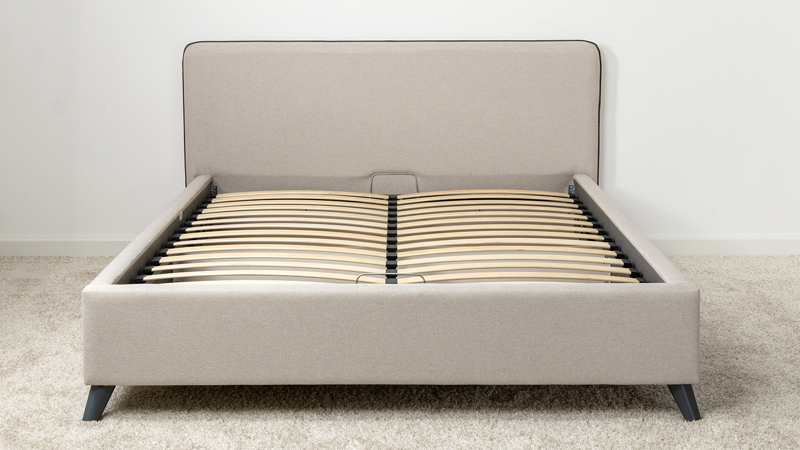 Основание кровати укомплектовано матрасодержателями. Жесткое кроватное дно из МДФ 6 мм. Задняя стенка изголовья выполнена в тех. ткани (спанбонд).