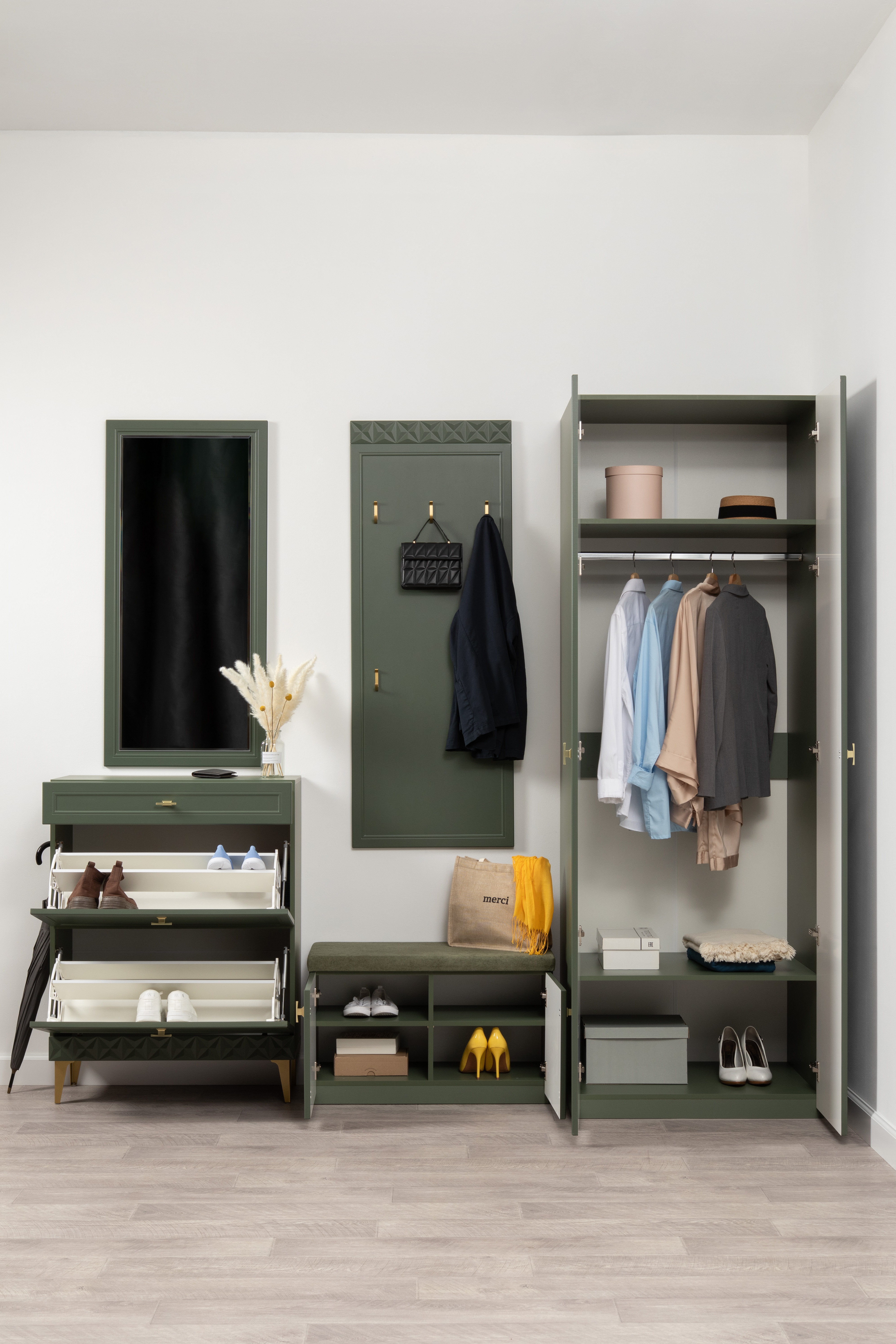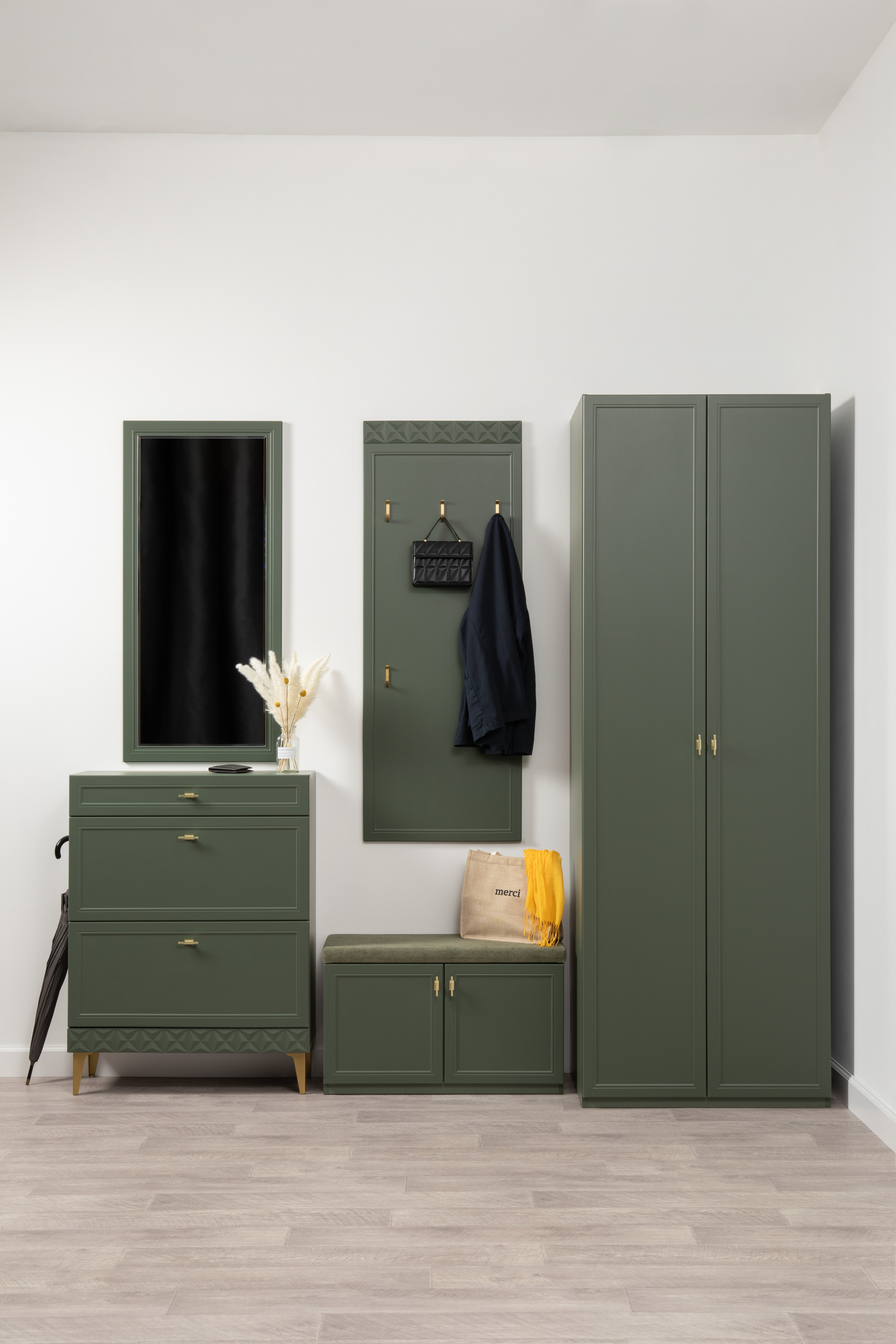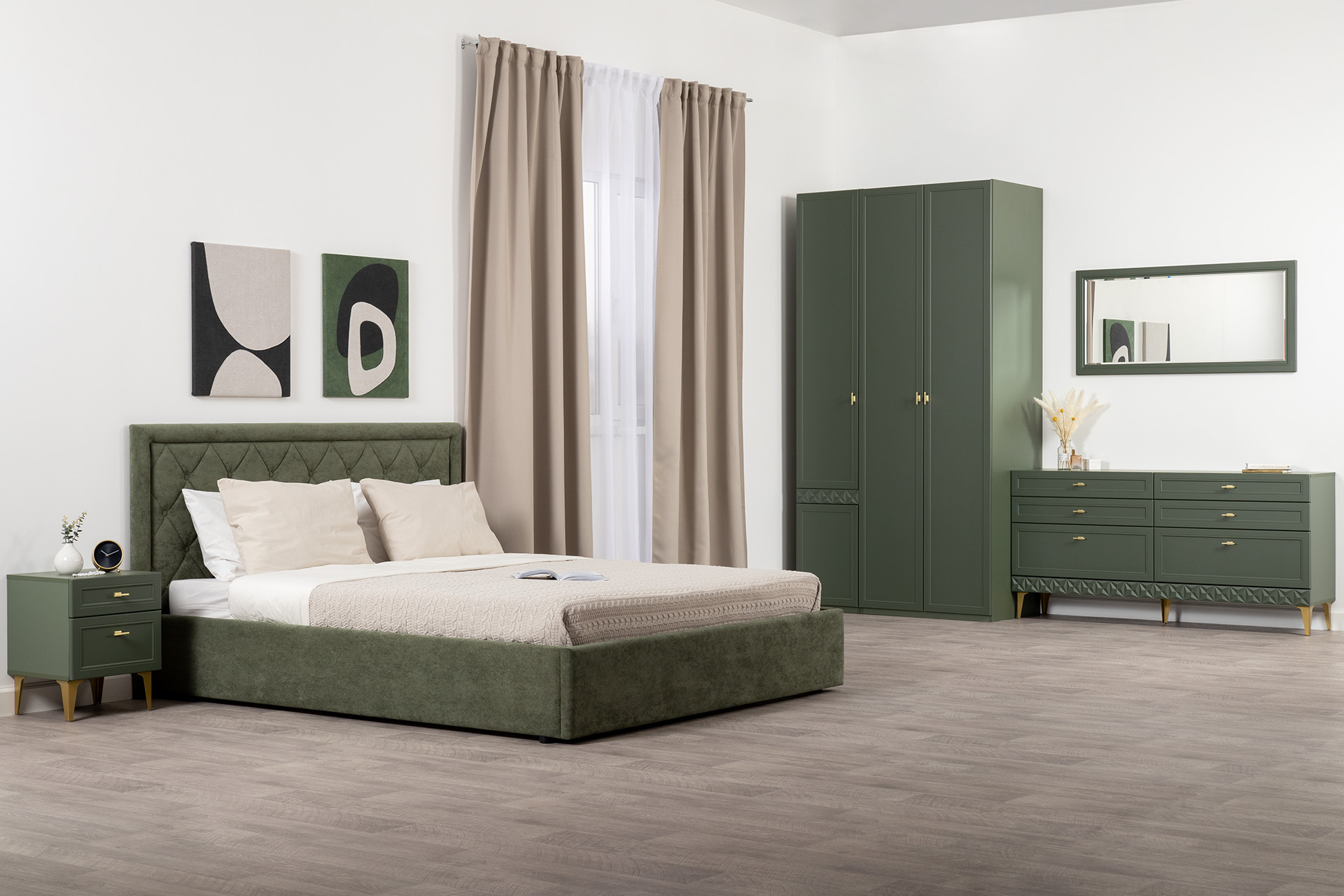 Изящные линии, глубокая фрезеровка фасадов из МДФ и благородные оттенки. Утончённая «Слоновая кость» и изысканная «Олива Шагрень» с глубоким зелёным тоном — создают атмосферу уюта, тепла и благородства. Металлические ручки и опоры золотого цвета придают мебели утончённый блеск, а петли и направляющие с доводчиками обеспечивают плавное и бесшумное закрытие фасадов.