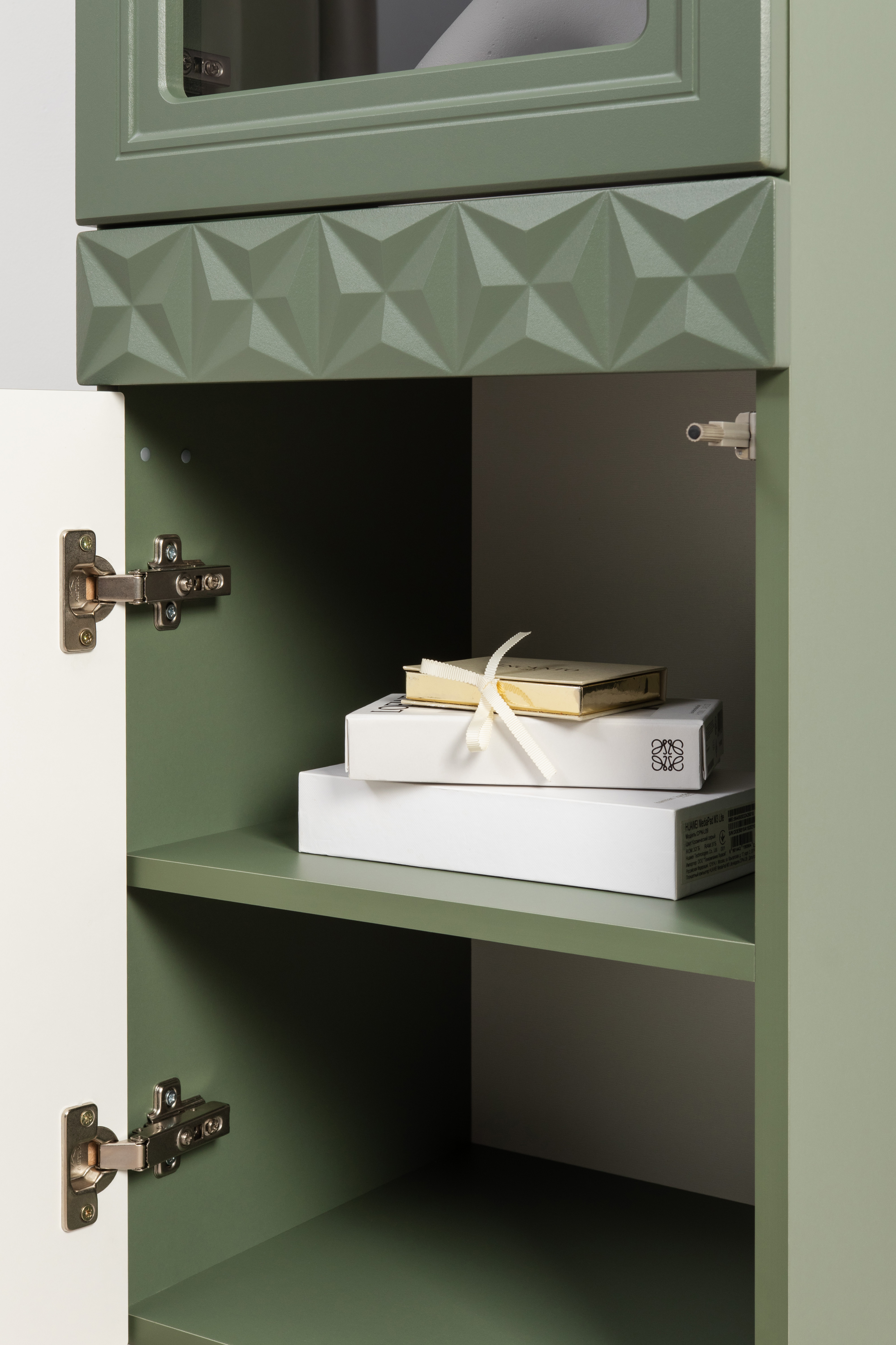 Шкаф-витрина Марион 16.397.01 дымчатый зеленый K521, олива шагрень AG 1050 ПВХ (собирается на любую сторону)