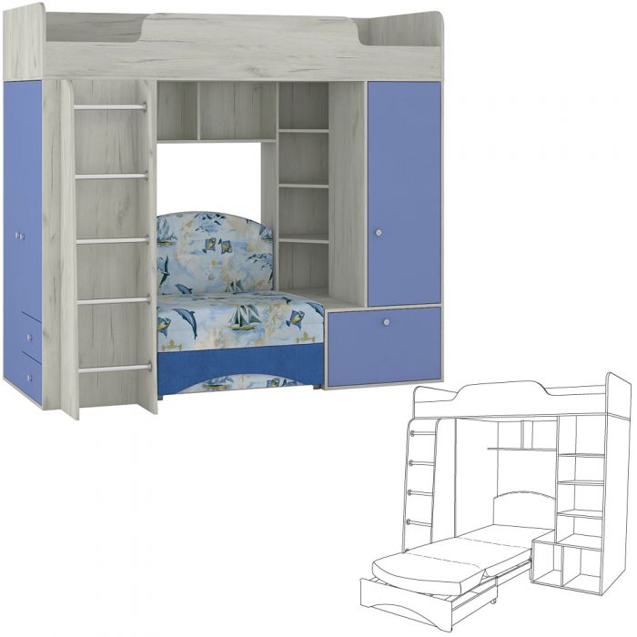 Кровать-чердак Тетрис 1 366 дуб белый craft мармара голубая