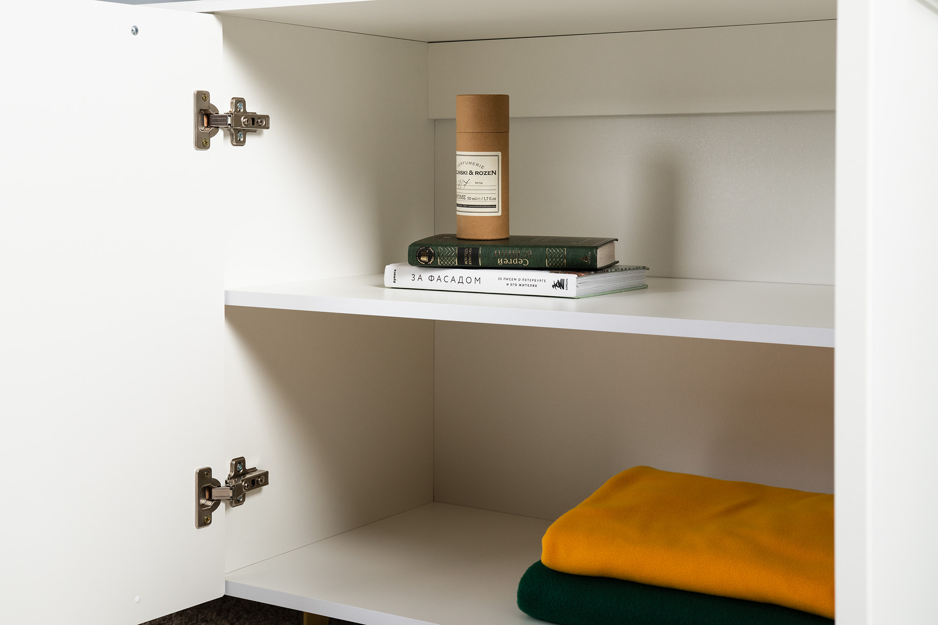 Фасады МДФ с фрезеровкой и верхняя крышка из МДФ сочетаются с металлическими ручками и опорами, создавая притягательный акцент в интерьере.